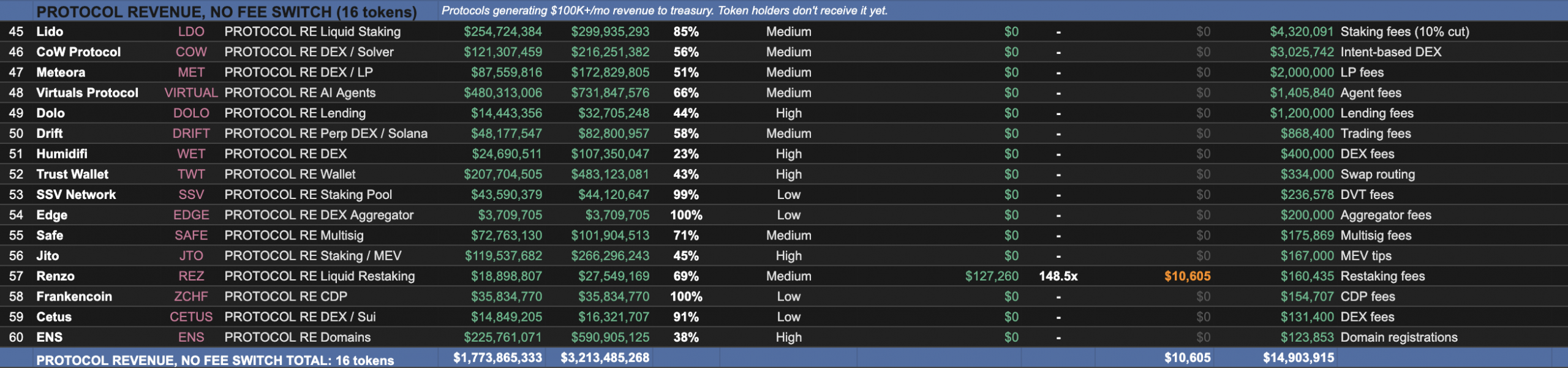 Một cách chơi khác cho những ai thích đánh cược vào sự kiện, lô tô với con tim là tìm những token chuẩn bị “bật công tắc” chia revenue. Lido, Meteora, Drift, và CoW Protocol đều đang kiếm tiền rất tốt nhưng chưa chia cho holder, nếu một ngày nào đó họ quyết định lật bài thì giá sẽ bay ngay vì thị trường sẽ định giá lại hoàn toàn.