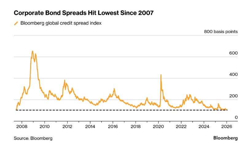 Hai chỉ số đáng chú ý đang ở mức rất thấp – corporate bond spread (chênh lệch lãi suất trái phiếu doanh nghiệp) và VIX (chỉ số đo lường sự biến động của thị trường). Cả hai đều đang báo hiệu rằng thị trường đang trong trạng thái quá tự tin, ít lo ngại về rủi ro.