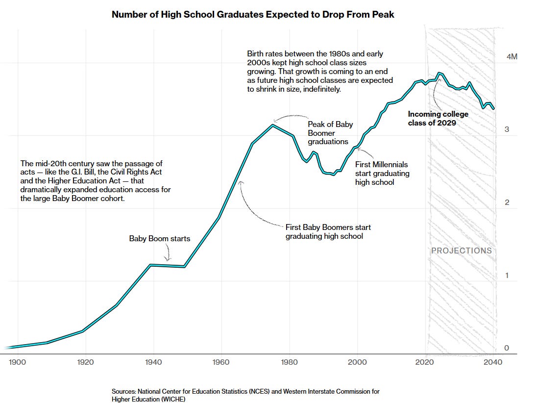 Giáo dục đại học Mỹ đang đi qua thời hoàng kim của mình là xu thế không thể đảo ngược. Trong vài thập kỷ qua, các trường đại học Mỹ đã mở rộng đáng kể về quy mô, xây thêm nhiều cơ sở vật chất, tăng đội ngũ giảng viên và nhân viên. Tất cả những khoản đầu tư này dựa trên giả định rằng số lượng sinh viên sẽ tiếp tục tăng hoặc ít nhất là duy trì ổn định.