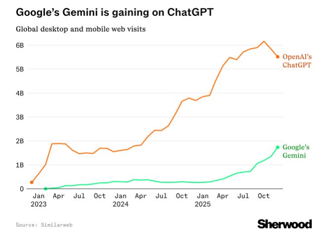 Trong cuộc đua AI, có sự thay đổi đáng chú ý. Gemini của Google đang tăng thị phần, trong khi ChatGPT của OpenAI giảm. Điều này cho thấy cuộc cạnh tranh trong lĩnh vực AI đang ngày càng gay gắt và không có ai có thể tự mãn mãi với vị trí dẫn đầu.