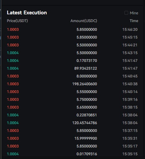 Trong khi USDC trên hầu hết các sàn lớn giao dịch quanh 0.997-0.995, thì trên sàn A , giá thấp hơn thêm 5-10 bp. Thanh khoản mỗi level chỉ khoảng 25-30k USD, volume ngày 500k-800k USD. Đó là cơ hội arbitrage rõ ràng.